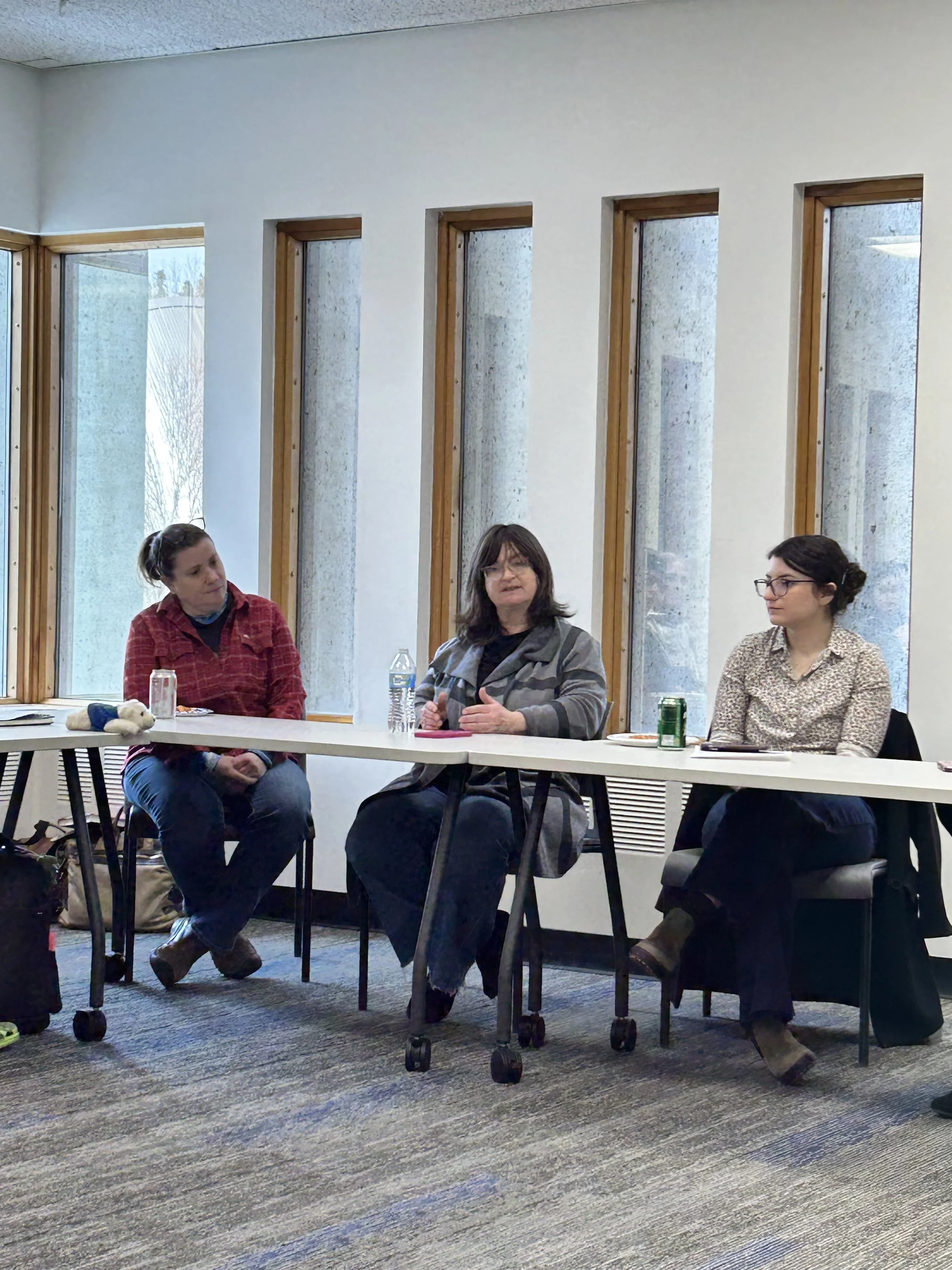 Professor of linguistics at Alaska Native Language Center Ana Berge, middle, discusses the changes done to ANLC.