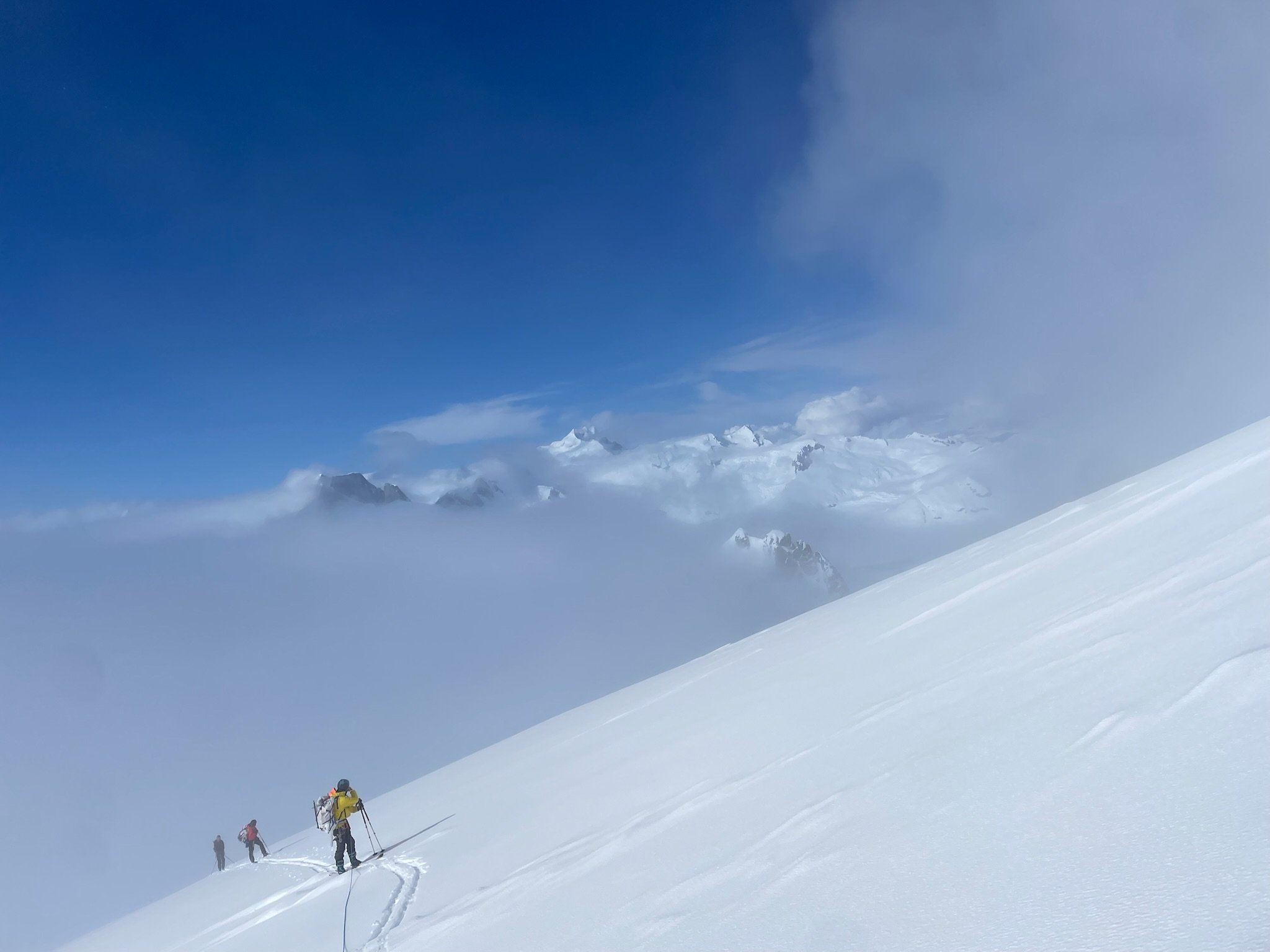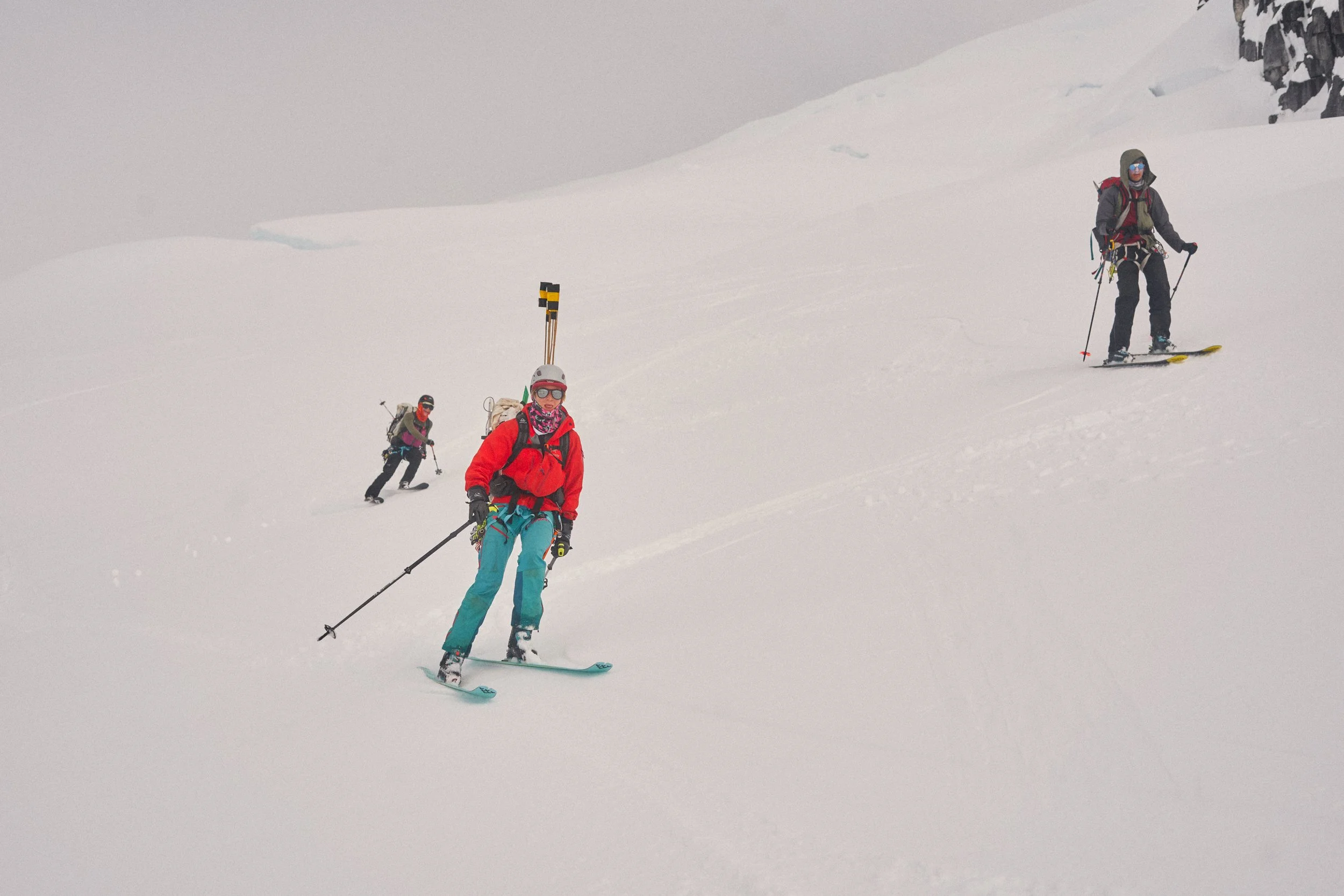 Torin Hooge, Hazel Probst and Leo Nordman ski back down Mt. Pratt to get back to basecamp after summiting.