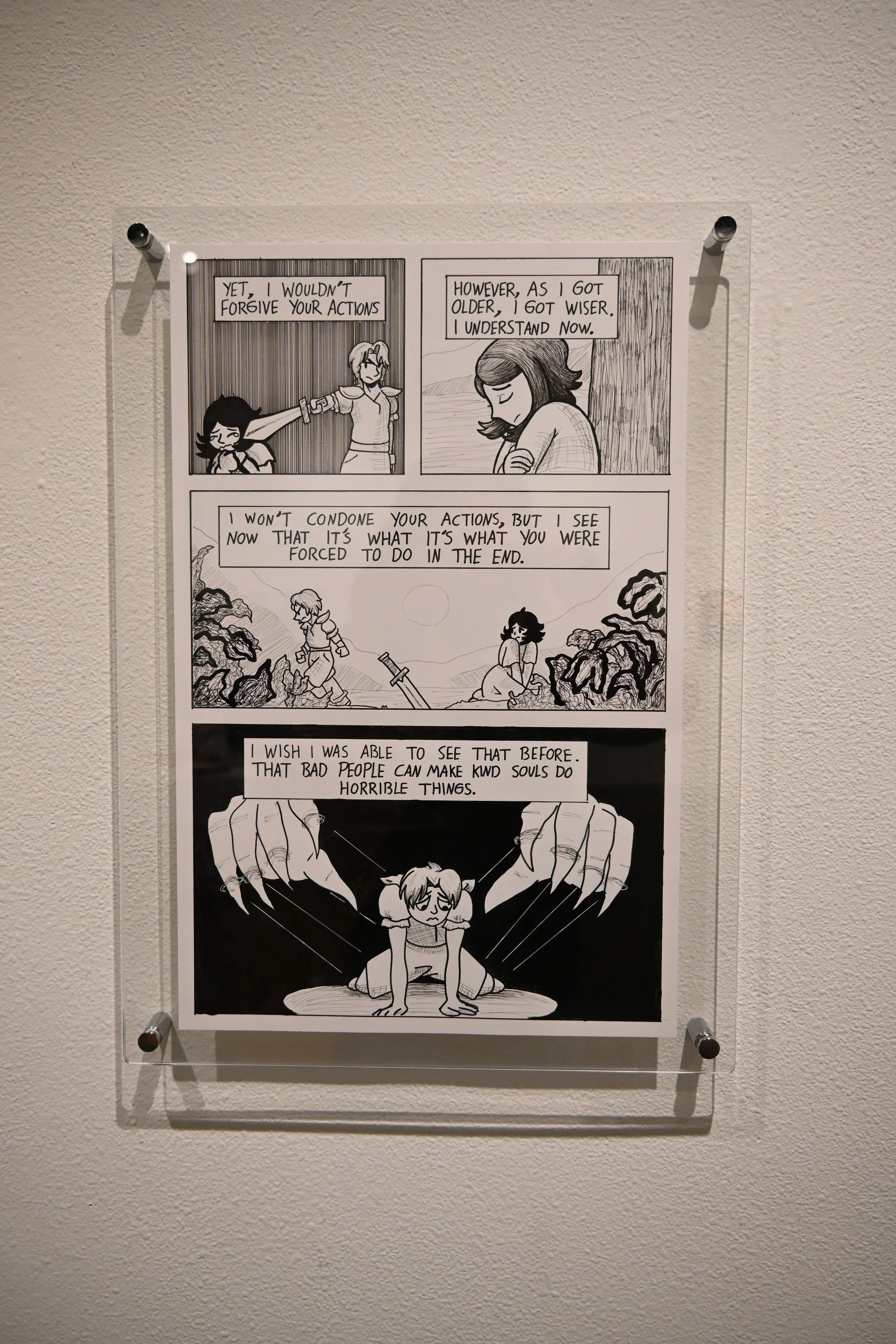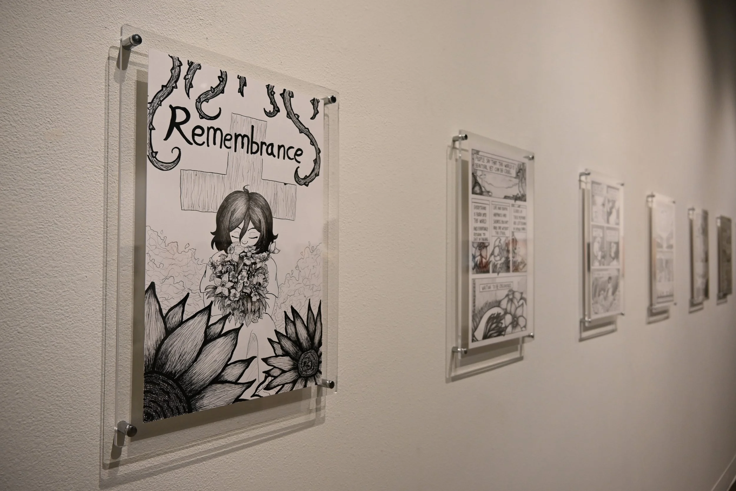 Priest’s exhibition includes both digital narrative and hand-drawn comics that follow the female protagonist through a journey from innocence to grief and, eventually, toward acceptance. Priest said the story is both personal and universal as the experiences show emotional truths many people share.