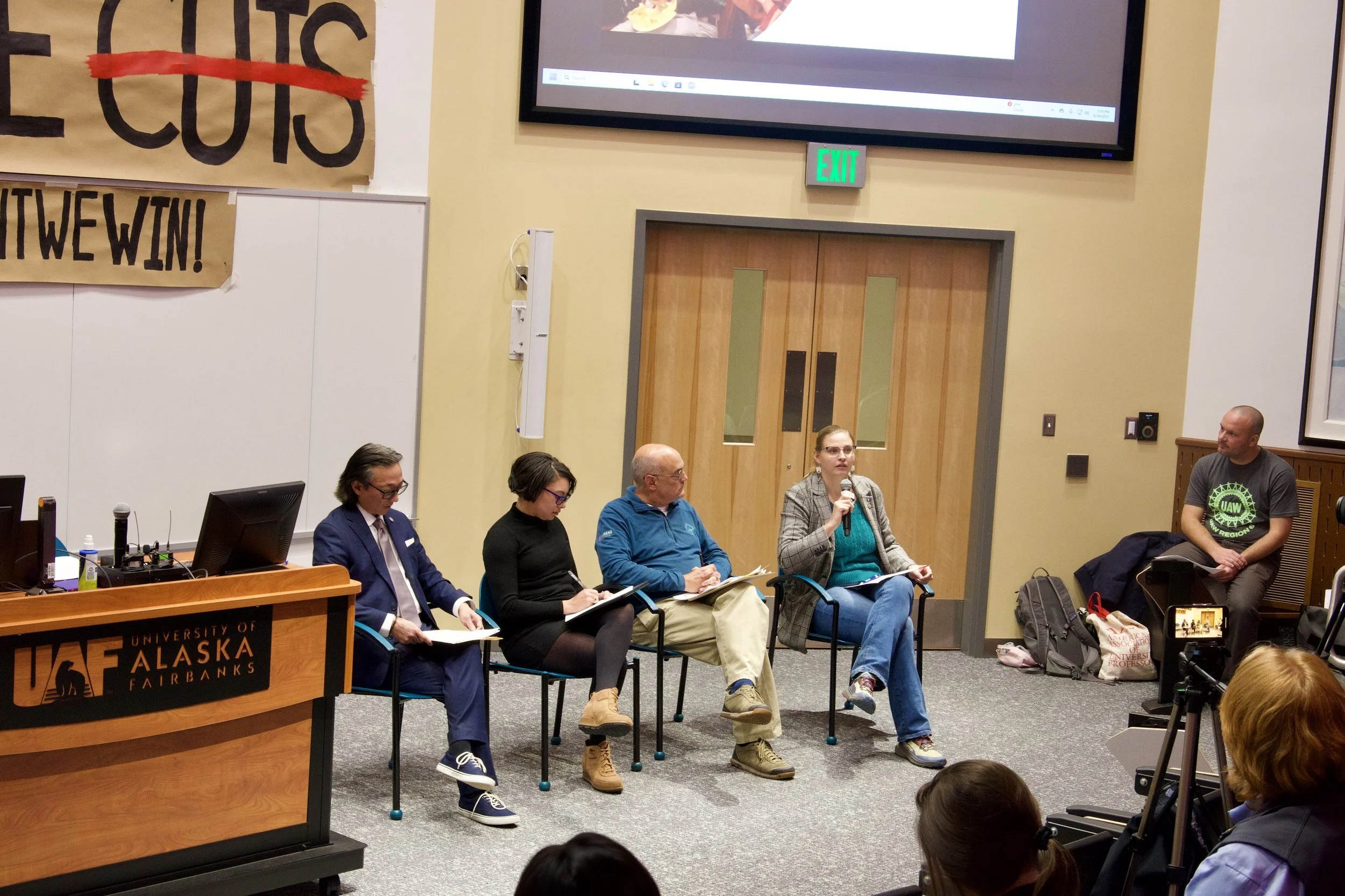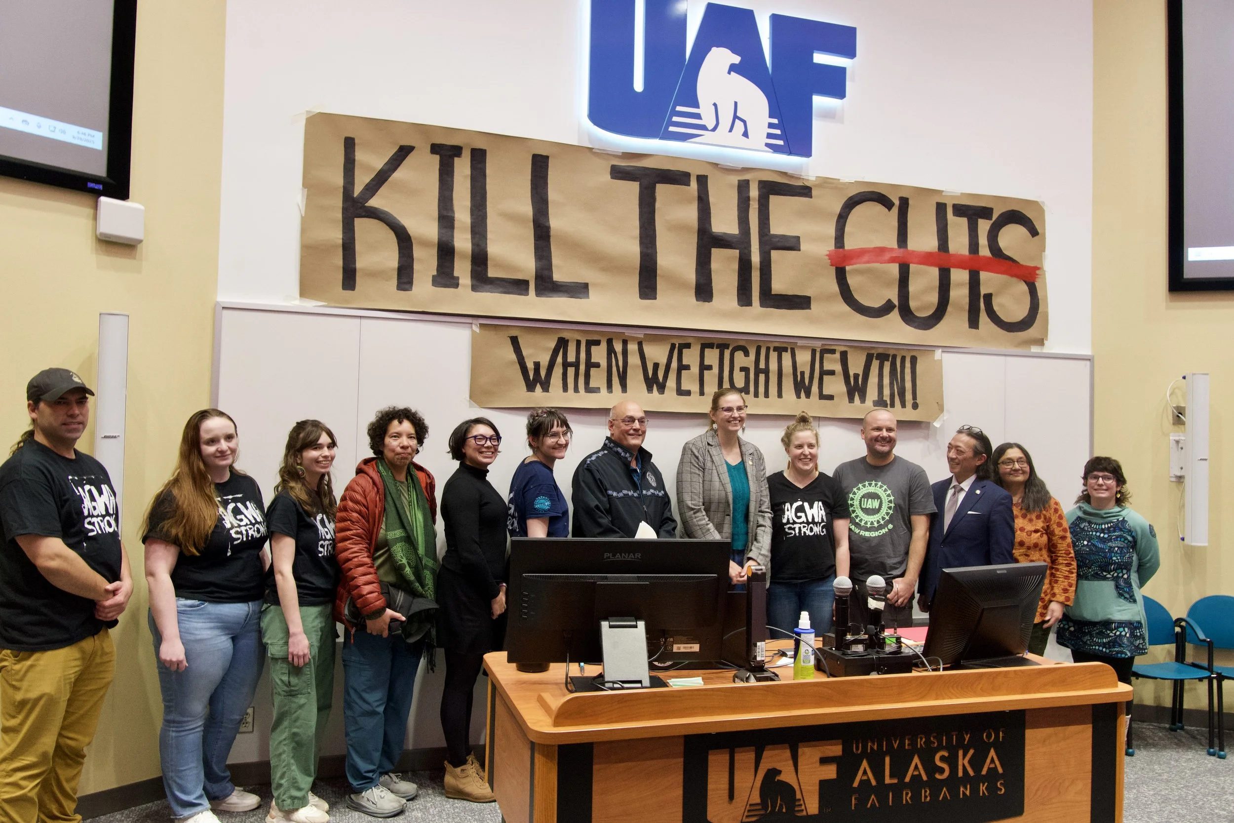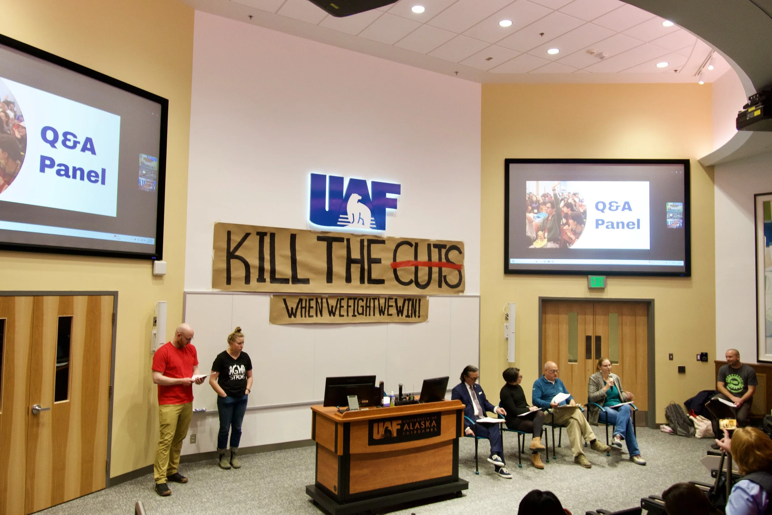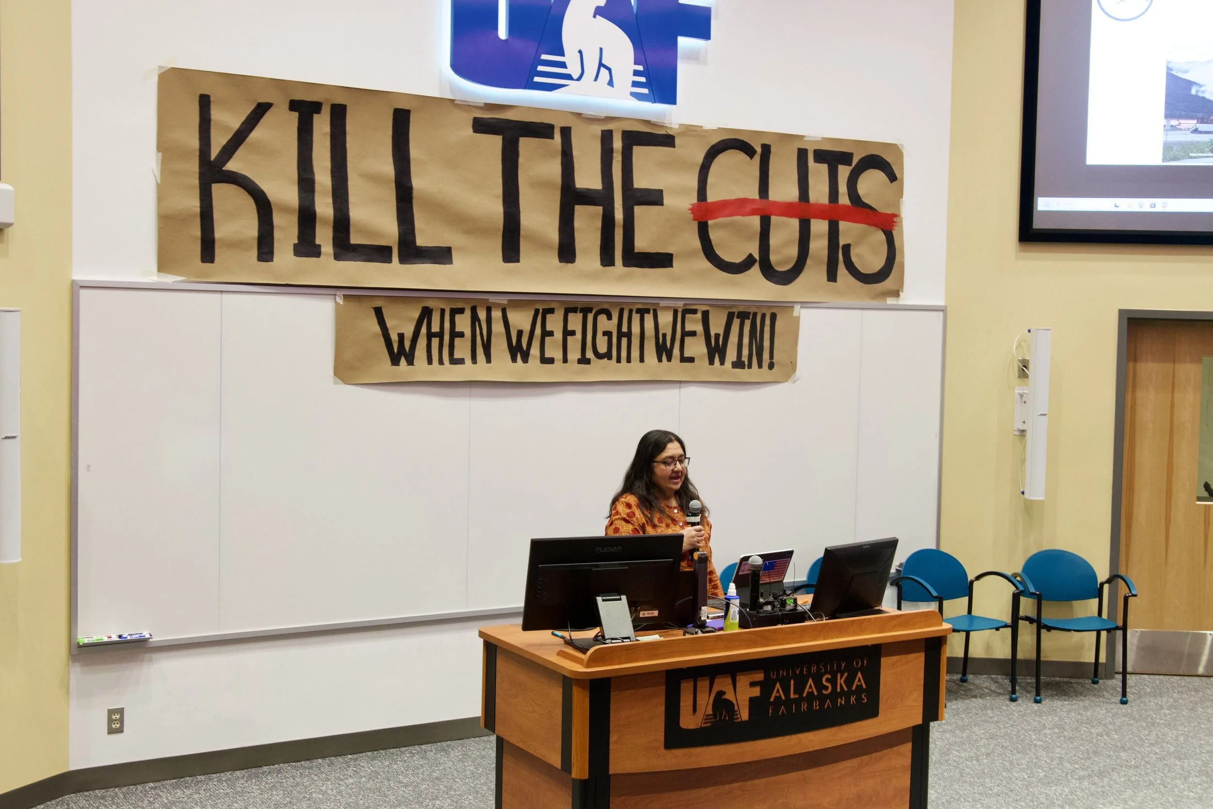 The auditorium was packed with UAF faculty and graduate students. “Union power” and “worker power” chants rang through the auditorium at the start of the event. A large sign at the back of the Schaible Auditorium where the event was held read: “KILL THE CUTS! WHEN WE FIGHT, WE WIN!”